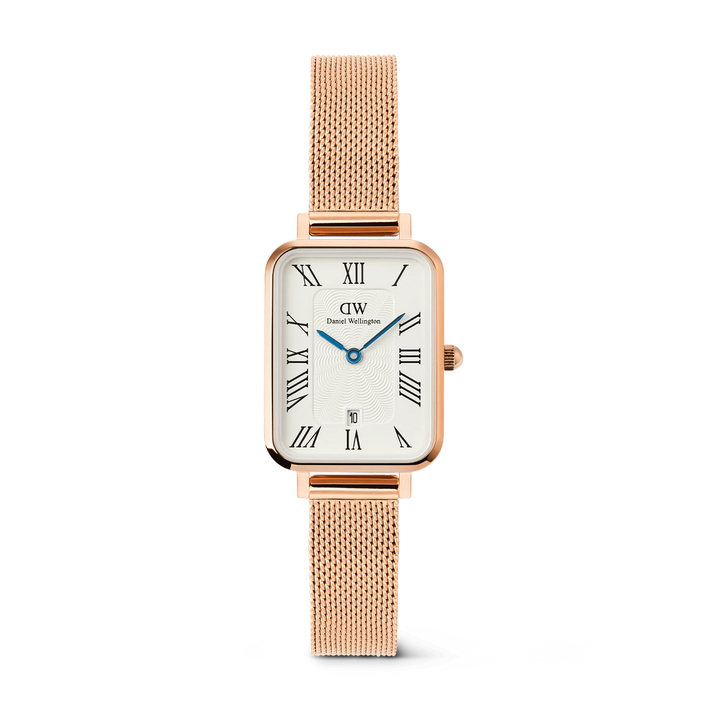 The Petite & Quadro Roman Numerals Date collection combines timeless Roman numerals with modern updates. The new date window at 6 o'clock adds practicality while preserving the collection’s signature elegance. Featuring a guilloché inner dial pattern for subtle texture and enhanced Roman numeral thickness, this refined design balances sophistication with functionality. Available in Gold, Silver, and Rose Gold, the collection offers a choice of 5-link, pressed mesh, or leather straps, all designed for comfort and style.