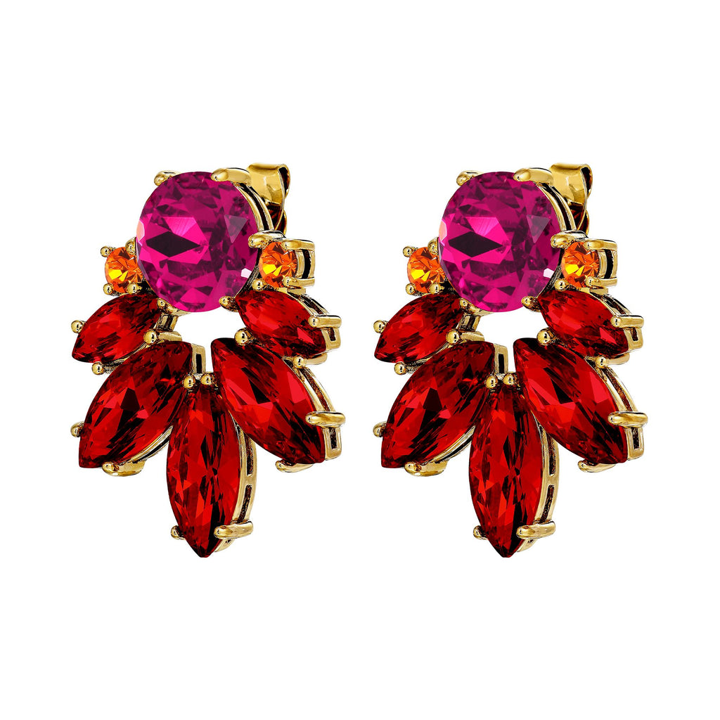 Elevate your look with the Dyrberg/Kern Drago Earrings in gold and red. Featuring a striking semicircle of leaf-shaped crystals that elegantly surround a larger, contrasting round stone, these earrings catch the light beautifully and add a refined touch to any outfit. Perfect for making a subtle yet memorable statement.