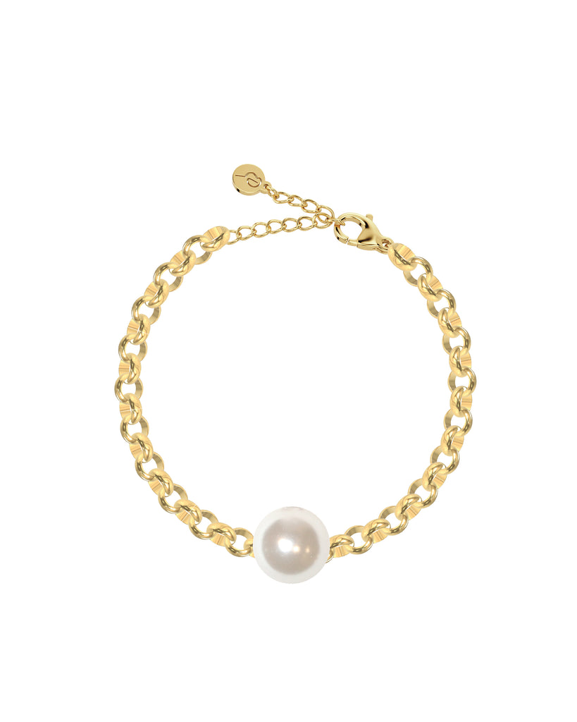 Pearls and chains blend in Lexie. The bracelet has a belcher chain, seen here in 14K gold plating, with an oversized mother of pearl attached directly to the chain.