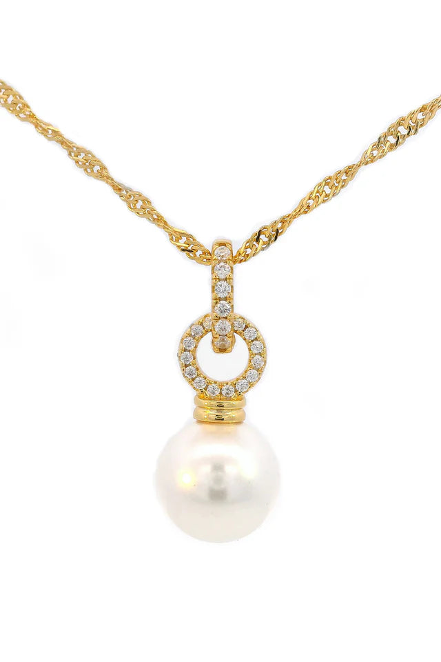 Made from 18k gold e-coated 925 sterling silver, this pendant features a stunning 10mm pearl charm, adding a touch of refined luxury to any look. Designed with versatility in mind, one side of the pendant is adorned with sparkling pave cubic zirconia, while the other showcases a sleek, high-shine finish, allowing you to easily switch between two exquisite styles.