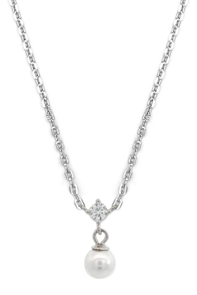 Crafted from rhodium-plated 925 sterling silver, this necklace features a lustrous 5mm pearl suspended from a claw-set cubic zirconia, adding a subtle yet radiant touch of sparkle.