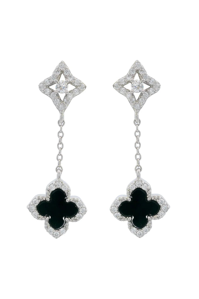 Crafted from Rhodium Plated 925 sterling silver, these stunning earrings feature a delicate yet bold combination of elements from the Fairwater collection. At the top, the Petite stud measures 7.94mm wide, offering a subtle sparkle that sets the stage for the striking Fairwater black agate clover, which measures 9.15mm wide.