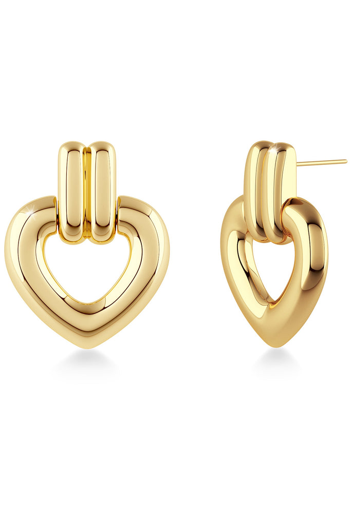 Beverly is the series with the heart that flirts with the 70s in a rounded chunky design. Beverly studs are a real door knocker and are quickly becoming favorites for both everyday and party wear. Beverly studs large earrings have a fixed link that holds the heart as a nice detail, seen here in shiny 14K gold plating. Feel free to wear the earrings together with other pieces from the Beverly series.