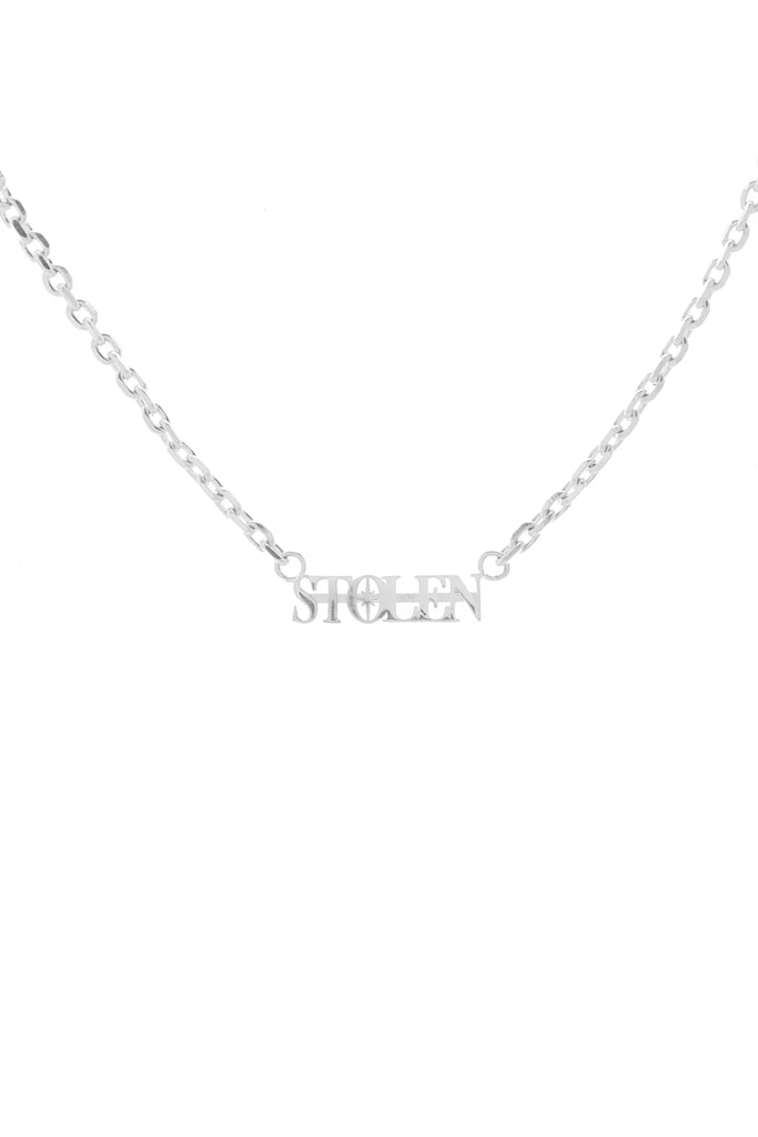 Stolen Serif Necklace crafted in high polish 925 sterling silver. Curbed chain links are met with a central 'Stolen' logo and North Star detailing.