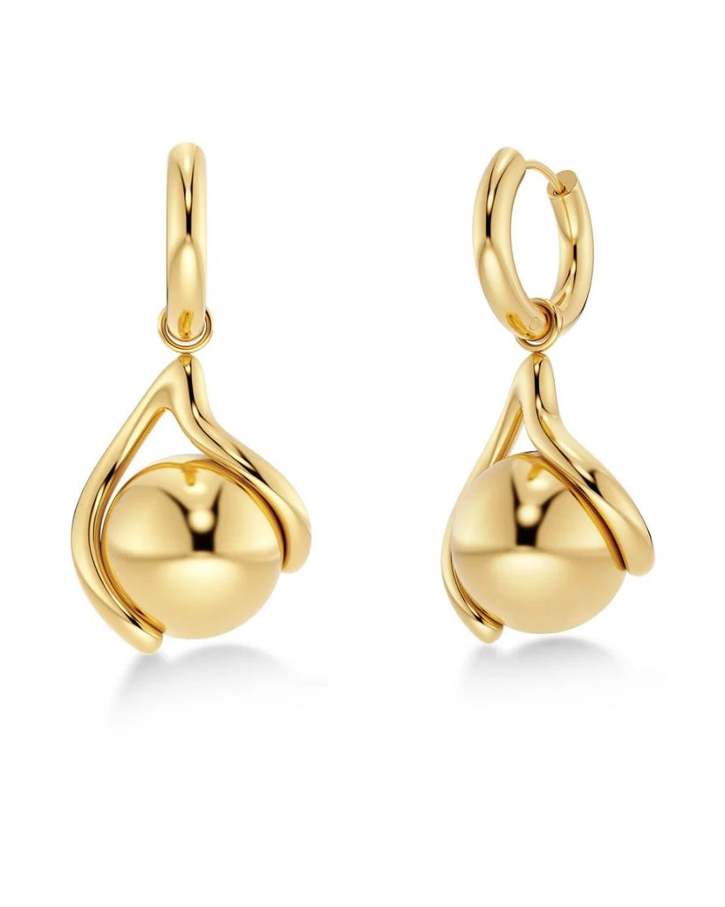 The Buddy line is based on a modernist flower bud in motion, sculptural and organic at the same time. Seen here in maxi hoops in 14K gold plating, for a more modern chunky feel. The pendant is removable so you can wear the earring with or without it. Looks great when paired with the necklace from the same line.